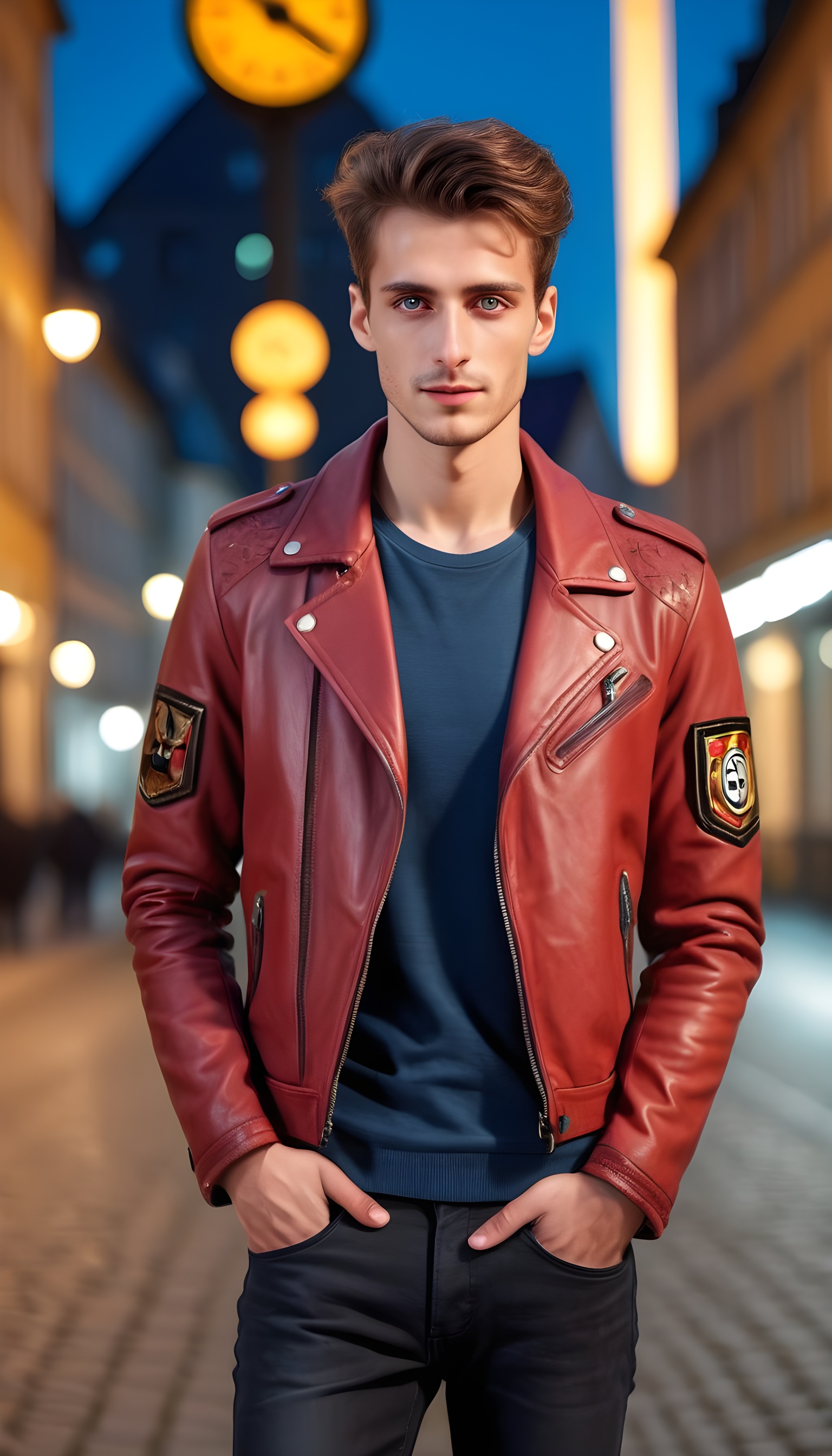 Realistic full image till hip of a young handsome Germany man with neat detailed eyes, elegantly attired in a vibrant Leather Jacket, set against the night outdoor backdrop of Germany.
